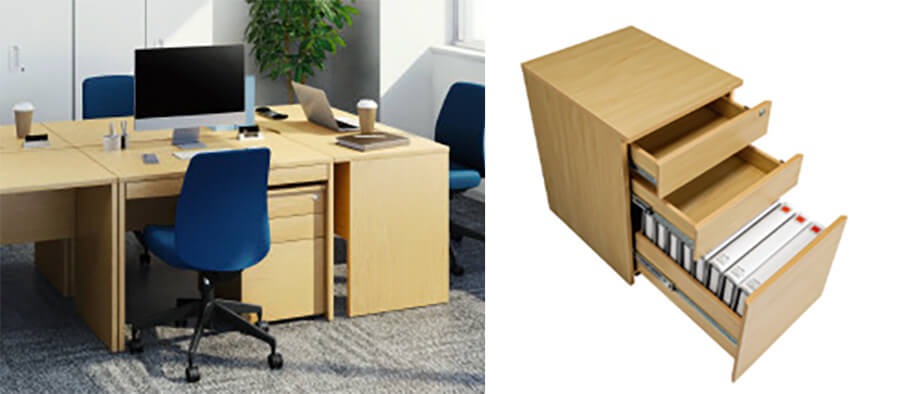 不二貿易のサイドチェストプレーンは、大容量の収納力を誇り、デスク周りの整理整頓に最適です。サイズの違う2種類の引き出しが付いており、小物から書類まで、さまざまなアイテムを効率よく収納できます。
