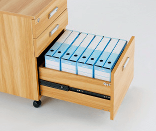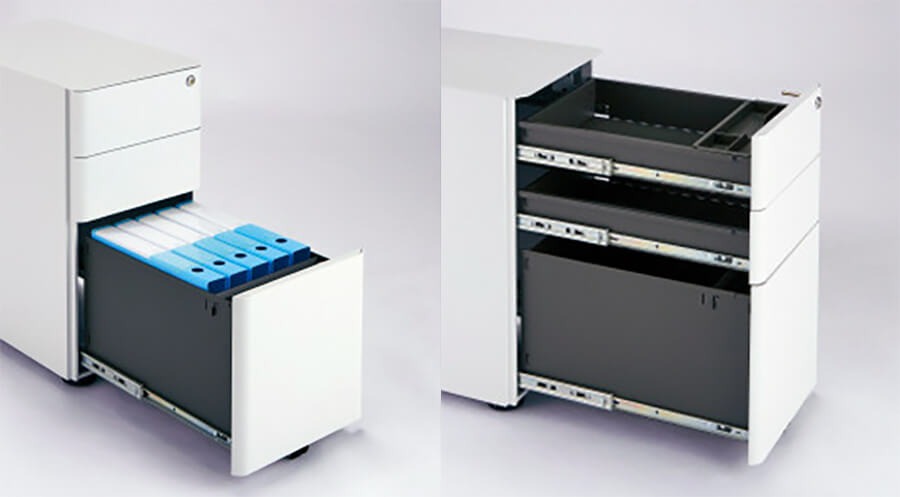 全ての引き出しはフルオープン仕様で、奥の物も取り出しやすく、効率的な収納が可能。特に、下段の引き出しはA4ファイルが収納できるサイズで、ビジネス用途にも最適です。