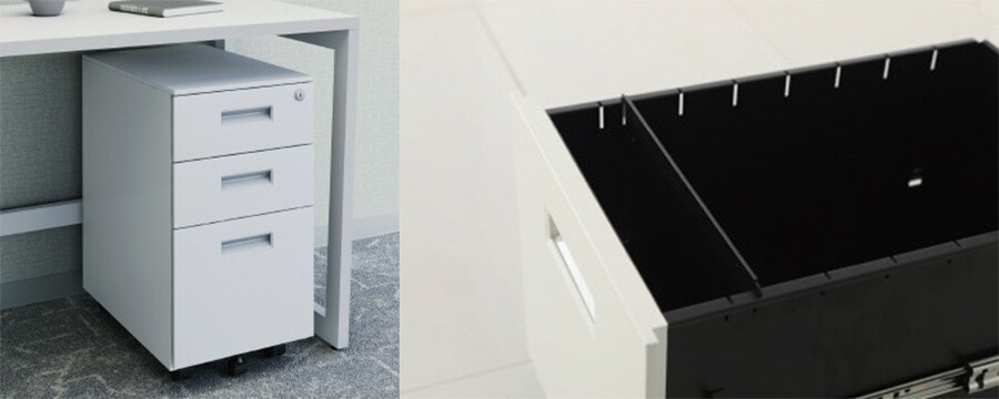 カウネットのスチールデスクワゴンは、仕切り板を設置できる「切り込み」付きです。仕切り版があることで、ファイルや書類が倒れることなく収納可能となっています。