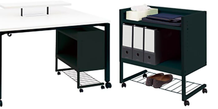 コクヨインベントFSデスクシリーズのサポートワゴンは、ファイルボックスや履き替え用の靴など、生活用品が収納できるコンパクトな棚を備えています。限られたスペースでも機能的に使える設計で、デスク周りをすっきりと整理整頓できます。