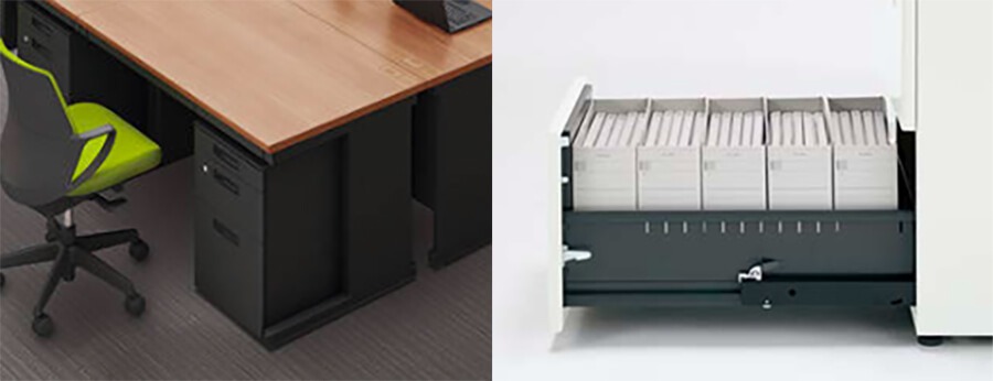 下段はフルオープン仕様で、奥のアイテムも簡単に取り出し可能。収納力がありながら、使い勝手も抜群です。また、鍵付きで大切な書類や貴重品を安全に保管できるため、オフィスや自宅で安心して使用できます。