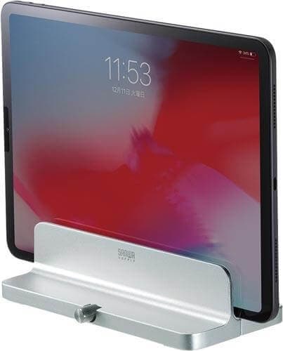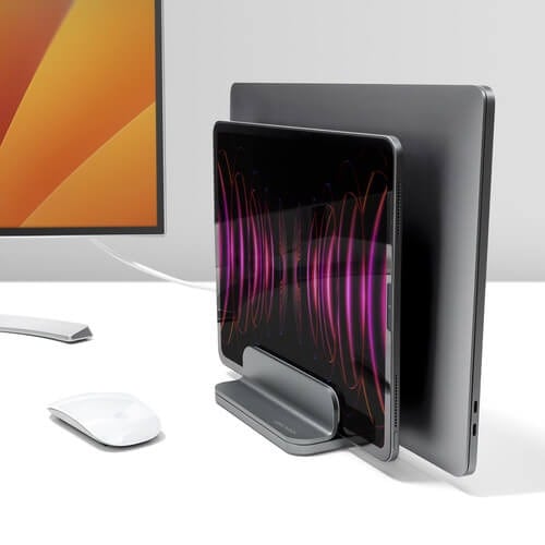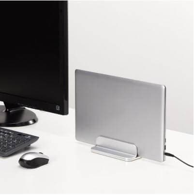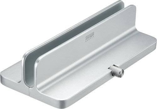収納時やクラムシェルモード時に使える、縦置きタイプのパソコンスタンドです。