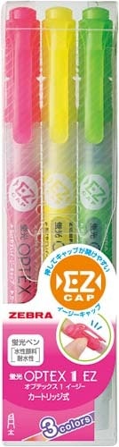 片手で簡単にオープンできる簡単キャップで、インクが詰め替えできるカートリッジタイプの蛍光ペンです。