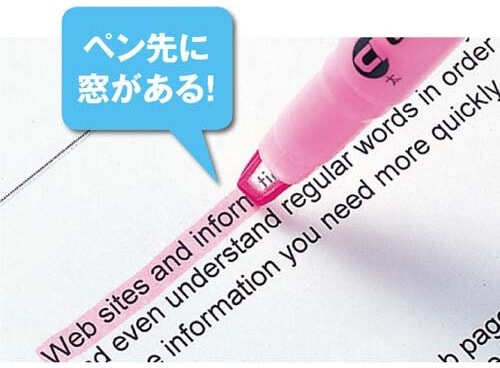 ペン先に透明窓がついている | マーキングしたい箇所が窓から見える | 辞書や資料など細かい文字に使う人 |