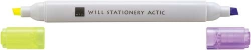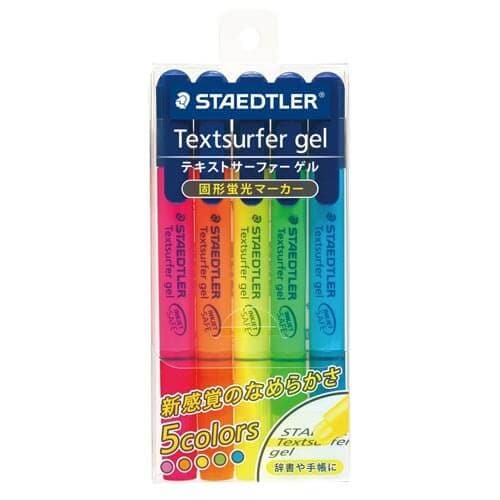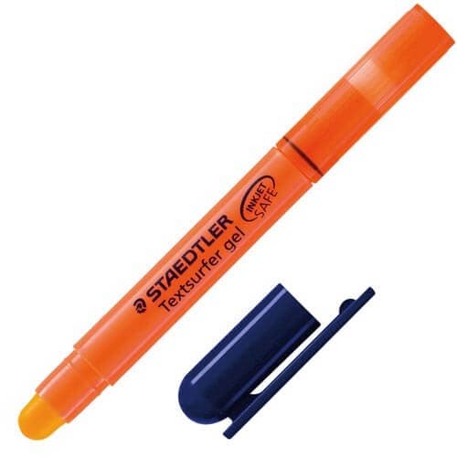 蛍光インクを固形にした蛍光ペンで、ペン先の丸いカタチが特徴です。なめらかな引きやすさで、辞書のように薄い紙に使用しても裏にインクがにじみません。