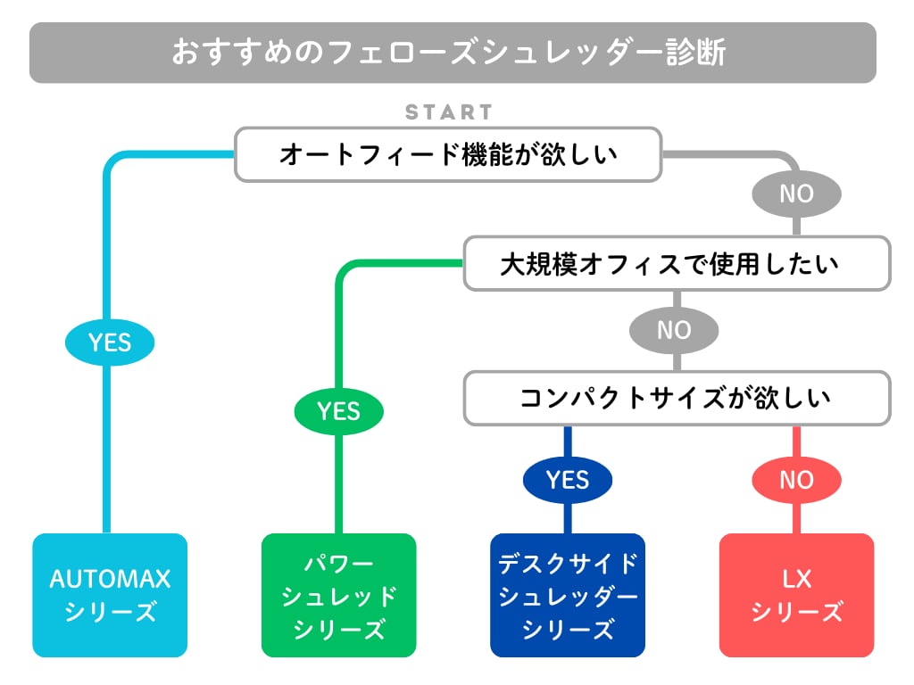 フェローズのシュレッダーには、お客様のニーズに合わせて4つのシリーズが用意されており、それぞれのラインの中で容量や機能などでモデルが分かれています。