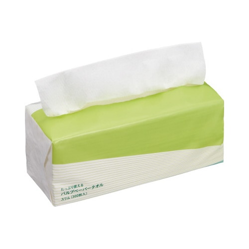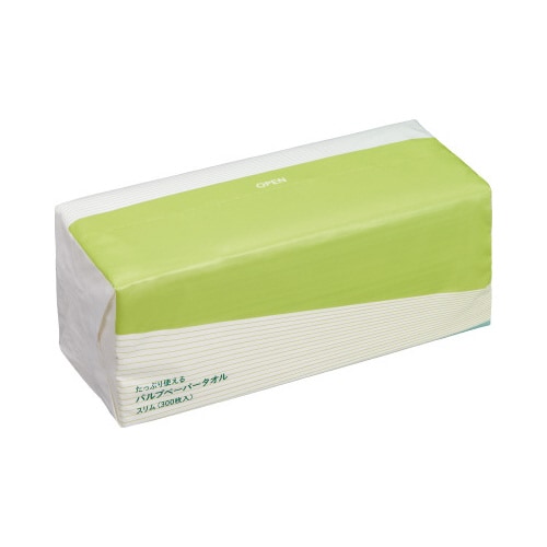 たっぷり300枚入りで取り換えの手間が省ける、パルプ100%ペーパータオル。経済的なスリムサイズ。 |