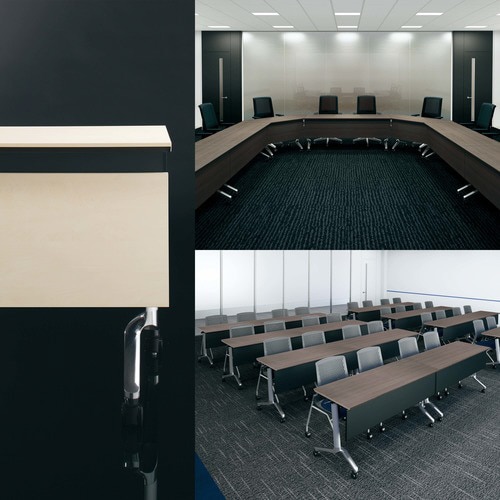 会議の集中力と満足度を高める充実した機能とバリエーション。組み合わせた際の美しさ、レイアウトのしやすさ、使用時の快適性、全てにこだわった平行スタックフラップテーブルの次世代スタンダード。 |