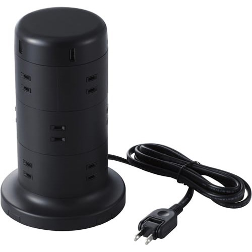 合計最大出力が4.8AのUSBポートを5つ備えたタワー型12口の電源タップです。USBポートや差込口は360度放射状に配しており、会議室の机などでの利用におすすめです。 |