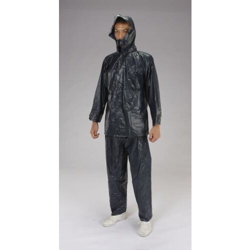 塩化ビニール製レインウェアーは、フードが外せるボタン留め仕様。袖口は二重袖のゴム絞りで、水の侵入を防ぎます。LLサイズ。 |
