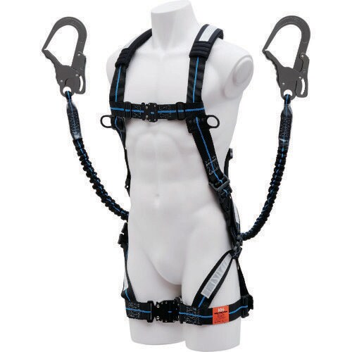 発注コード:200−8353 | 用途:2m以上の高所作業者。 | サイズ:L | 色:ハーネス&ランヤード/黒/青ライン | 腿バックル:ワンタッチ…