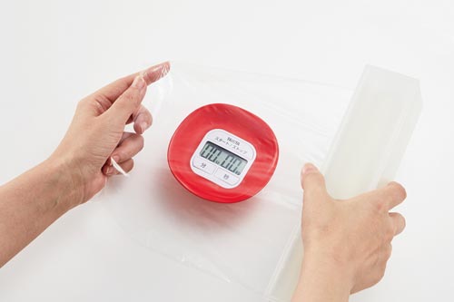 調理ラップをきれいに装着できるタイマー。水滴、油、粉末を防ぎ洗う手間がいらない。 |