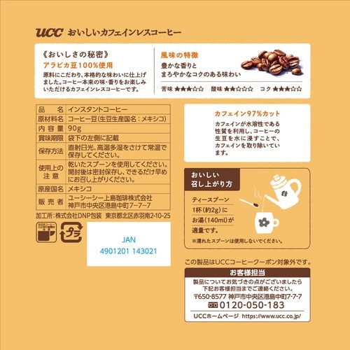 コーヒー本来のコクと香りを楽しめる、コーヒー好きのためのカフェインレスコーヒー。厳選アラビカ豆100%使用し、本格的な味わいに。たっぷり90gタイプ。 |