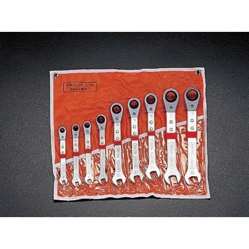 9本組のラチェット式片目片口スパナセット。クロムバナジウム鋼で耐久性が特徴の便利な工具です。 |