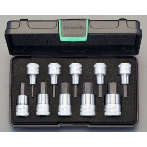 頑丈な圧入式ヘックスビットソケットセット。10個組、樹脂ケース付きで持ち運びにも便利です。 |
