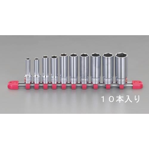 差込角3/8インチ、全長が長く深い部分に届くディープソケット。7mmから22mmまでの6角ソケット10点セット、ホルダー付きです。 |