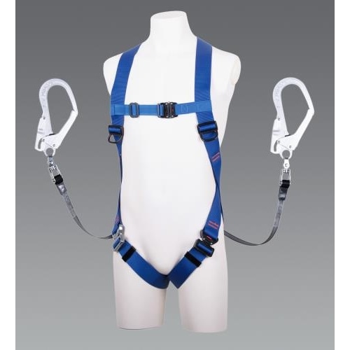 藤井電工の最軽量モデル。常時巻取式ツインランヤードとロック機構で、高所作業の安全を力強く支える。ワンタッチ腿バックルで装着もスムーズ。 |