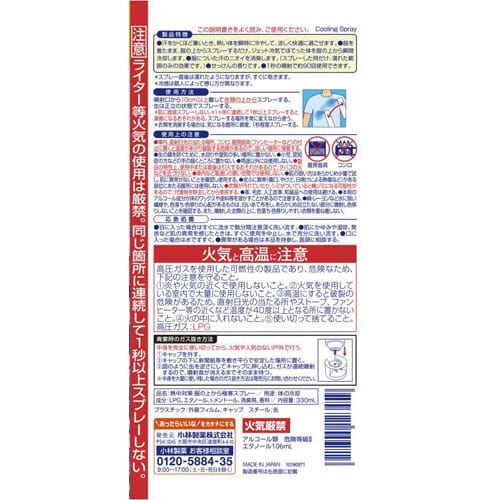| 注意事項 | ※ライター等火気の使用は厳禁。同じ箇所に連続して1秒以上スプレーしない。 |