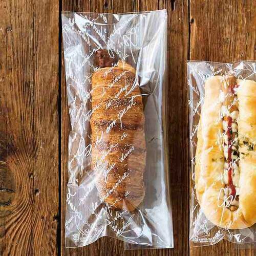 パンやお菓子を入れやすいように工夫された食品対応のOPP袋です。口が広いので商品を手早くセットできます。白の英字デザインがおしゃれで、中に入れた商品をより魅力的に見せます。ベーカリー店様におすすめ。 |