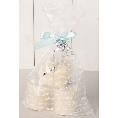 白の文字デザインがおしゃれで使いやすいギフトバッグ(平袋)です。ふんわり透けるフロスト素材が商品をきれいにみせます。