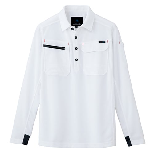 機能満載の長袖ワークポロシャツ。帯電防止・吸汗速乾・透け防止・UVカット多機能素材。両胸ポケット・左袖ペン差しポケット付。
