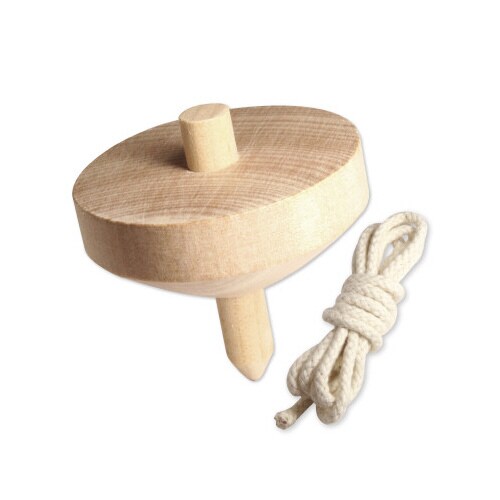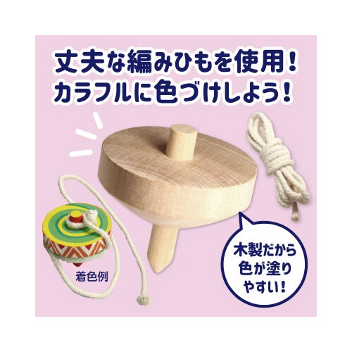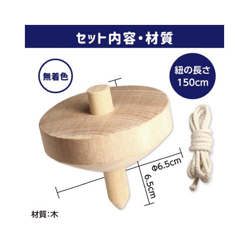 木製のコマです。無着色なのでオリジナルのコマがつくれます。平らなので自由に絵が描きやすくなっています。丈夫な組みひもを使用しています。木製なので床が傷つきにくくなっています。 |