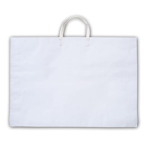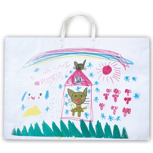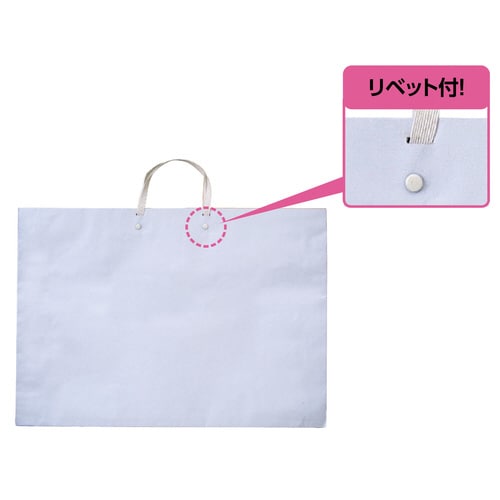 4切画用紙や、B3サイズの用紙を折らずに入れられるサイズの紙袋です。取っ手を外れにくくするリベットがついています。ペンや色鉛筆、クレヨンなどでデザインを施すことができます。 |