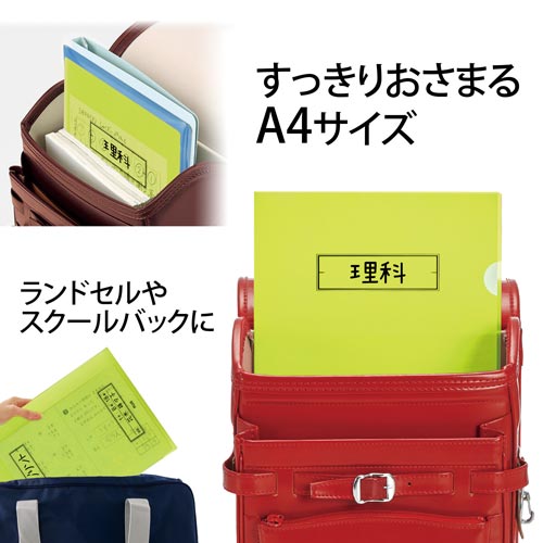 年・組・番・氏名が書ける名前記入欄付なので、一目で誰のファイルか分かる。ランドセルにすっきり入る小さめサイズ、生徒がプリントを持ち帰る際に便利。表紙が半透明で、収納したプリントを確認しやすい。 |