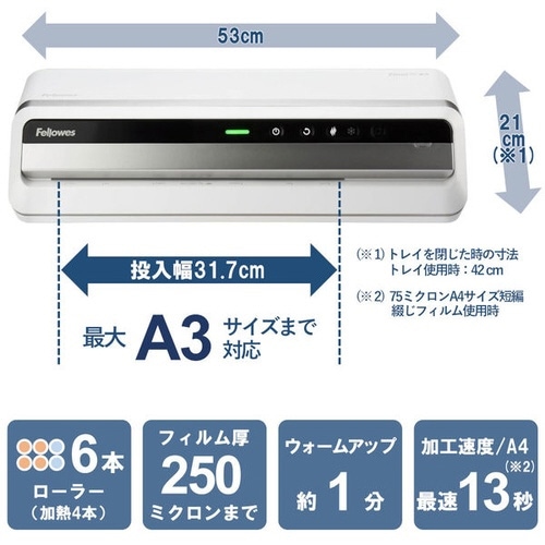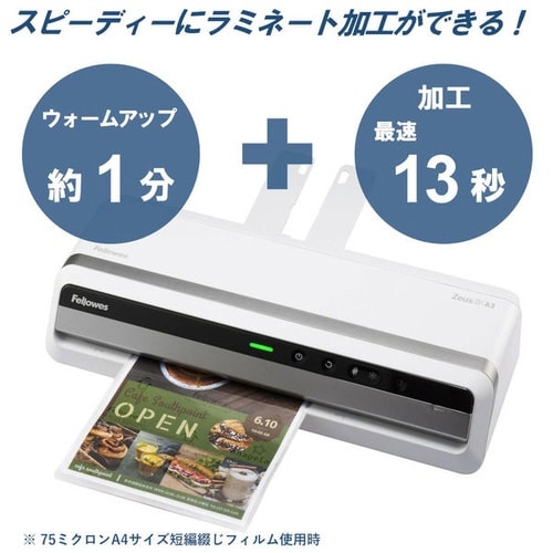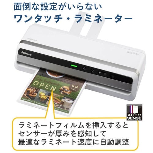 スイッチオンから加工開始まで最短60秒。フィルム詰まり対策機能搭載で安心。Zeus3 A3は、挿入されたフィルム厚を検知し、キレイな仕上がりのための設定を自動で行います。 |