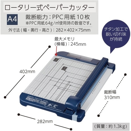 チタン加工刃搭載で、切れ味持続2倍・切れ味110%・刃先の硬度2.5倍(全て当社比)。スライダーを前後にスライドするだけで簡単に裁断ができるロータリー式(裁断能力:PPC用紙10枚)。 |