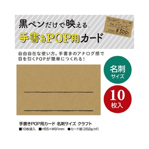 シンプルなPOPにしたい時に。規格サイズなのでカードスタンドにも最適!黒ペンだけで映える!手書きPOP用カード名刺サイズ・黒ペンで書くだけでナチュラル感が演出できるクラフト素材のカードです。 |