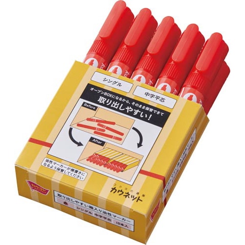 使って納得!安さと品質の油性マーカー(中字平芯)。オープンボックスパッケージだから、箱のまま保管してもマーカーが取り出しやすい! |