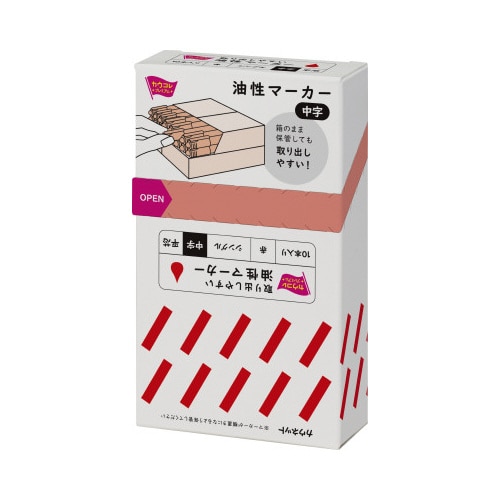 使って納得!安さと品質の油性マーカー(中字平芯)。オープンボックスパッケージだから、箱のまま保管してもマーカーが取り出しやすい!