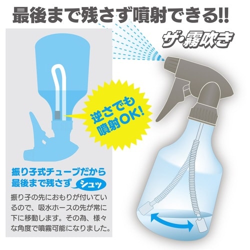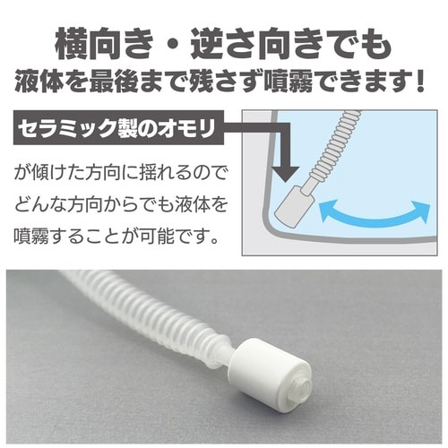 中身が少なくなっても、しっかりスプレー。重り付きのチューブが重力で貯まった水を追いかけるから少なくなっても使えます。 |