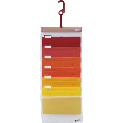 書類を省スペースで分類して収納できる壁掛けファイル。ポケットは取り外せるので、必要な分だけ持ち運びOK。 |