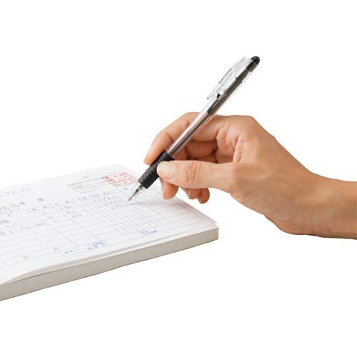 手が痛くならないグリップ付きでこの価格!お得な使い切りノック式油性ボールペン。 |
