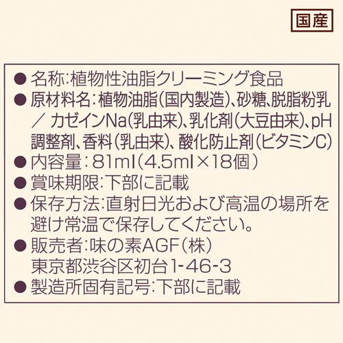 インスタントコーヒーやレギュラーコーヒー、紅茶などのコクを引き立て、まろやかな味わい、すっきりした後味に仕上げるコーヒーミルクです。いつものコーヒーのお供にコーヒーフレッシュとしてお使いください。 |