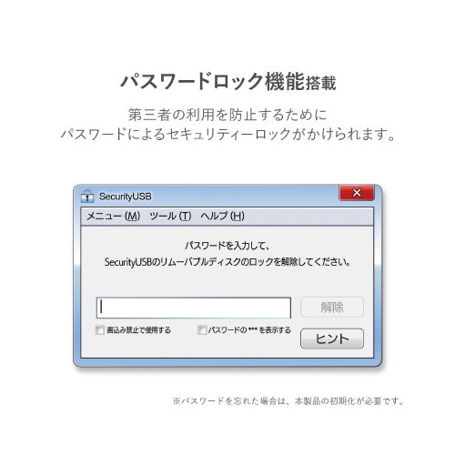 情報漏洩対策としてパスワードロック機能と共にハードウェアAES256bit暗号化機能を搭載した情報漏洩対策USB3.0メモリ。 |