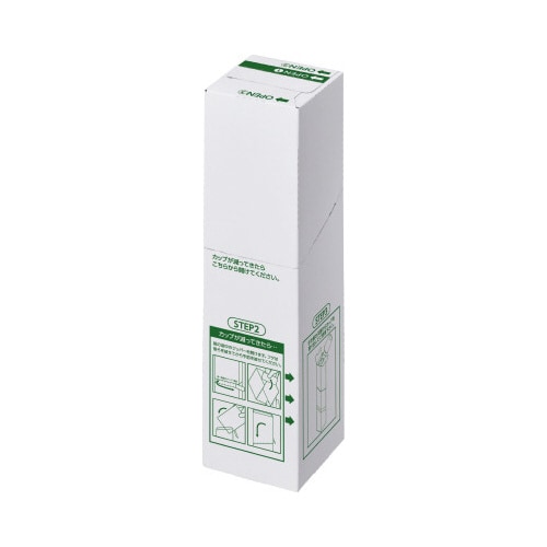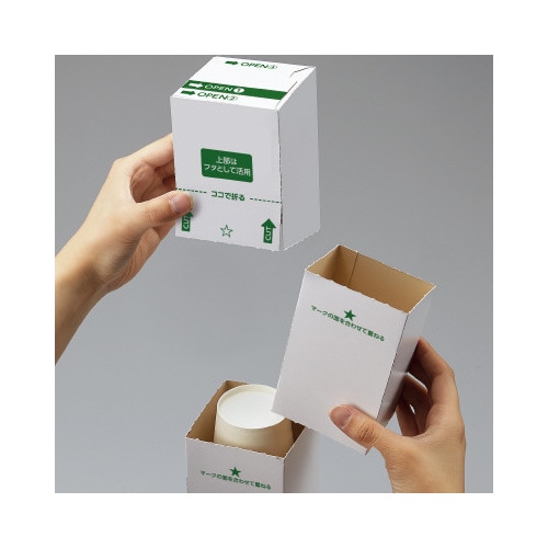 紙コップの残数に合わせ、ミシン目で切り取ることで箱が小さくまとまって収納に便利!箱の上部がフタになるから衛生的に使えます! |
