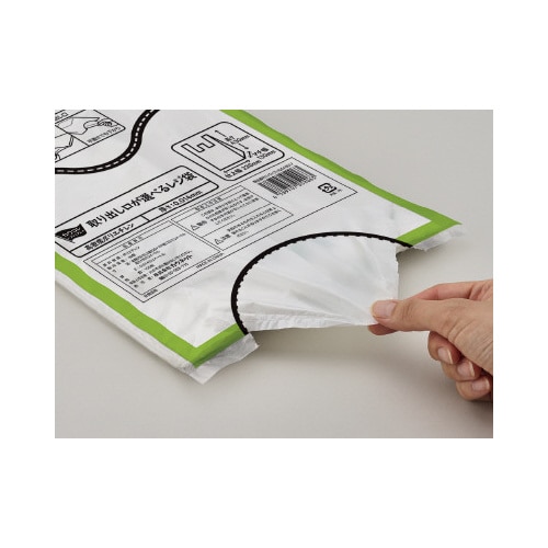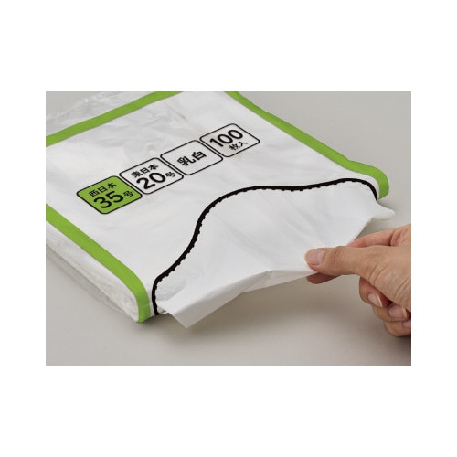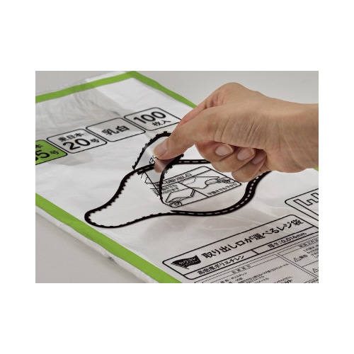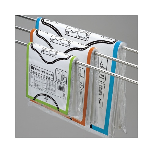 レジ袋の取り出し口が選べるから保管スペースに合わせて使えます!さらにパッケージの色分けで号数が一目瞭然!取っ手付きで結びやすいのでゴミ袋としても便利です。 |