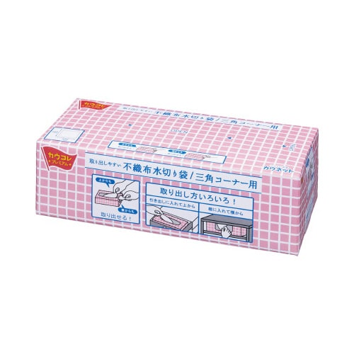 2か所の取り出し口で収納に便利な、不織布タイプの水切り袋。開け口が段違いで開きやすい。三角コーナー用。 |