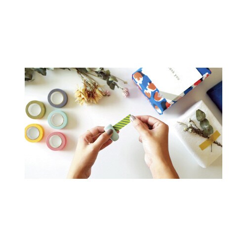 はさむだけでテープにセットできるので、これひとつで、複数のマスキングテープが使える便利なテープカッターです。 |