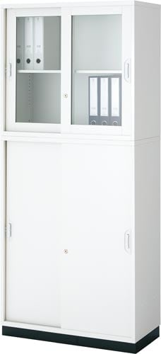 アッセスチール収納庫 幅800×奥行400×高さ1840mm 上下セット 上:引き違い(ガラス)、下:引き違い 上:2段、下:3段 配線穴なし 本体:ホワイト、扉:ホワイト、ベース:ブラック 1台