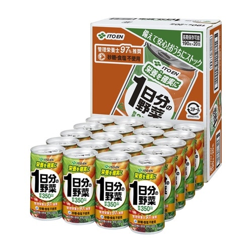砂糖・食塩不使用。製品1本当たり、厚生労働省が推奨する1日の野菜摂取量350g分を使用した野菜汁100%飲料です。容量も1缶190gと飲みきりにも適しています。 |