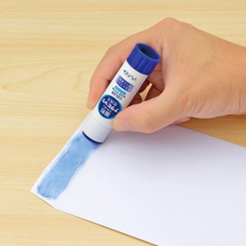 塗ったところがよくわかる、ブルーの色消えタイプのスティックのりです!乾けば透明になるので、白い封筒や書類にも安心してお使いいただけます。 |