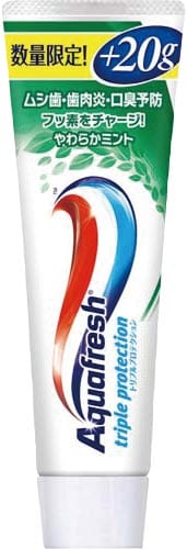 歯肉炎予防、口臭予防、虫歯予防の3つの効果が赤、白、青の3色ストライプになったユニークな歯磨き粉!