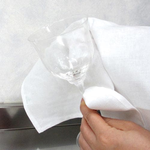 長い繊維でケバが残りにくく適度な硬さが特長の麻に、吸水性と柔らかさを引き出すため綿を50%配合。グラスを透明に磨き上げます。何度もグラスをこすっても劣化しにくい、摩擦に強い平織りのふきんです。 |