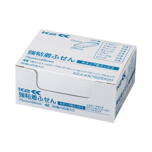 強粘着ふせん K2 75×25 ネオン混色 7色混色 1箱(20冊入) K2メ−KN7525X20 ふせん 強粘着