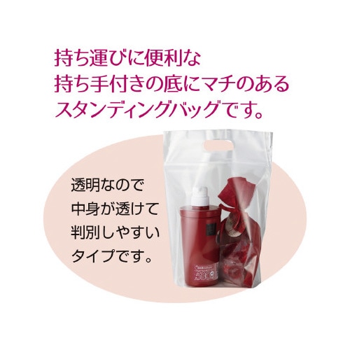 持ち運びに便利な持ち手付きの底にマチのあるスタンディングバッグです。透明なので中身が透けて判別しやすいタイプになっています。青果の陳列やノベルティセットの販売に便利です。業務用100枚仕立て。 |