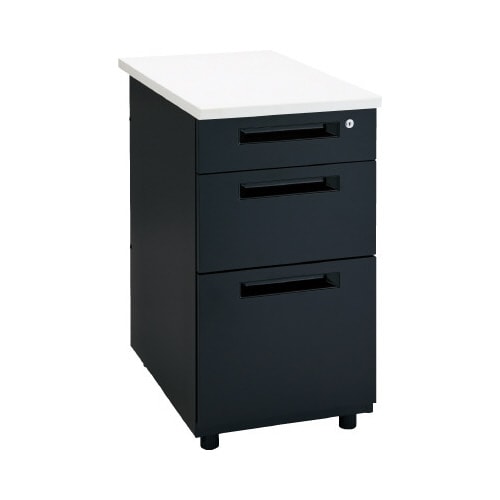 デスクサイドでの使用だけでなく、引出しを3段装備しており下段はフルオープンでA4ファイル収納可能。 |